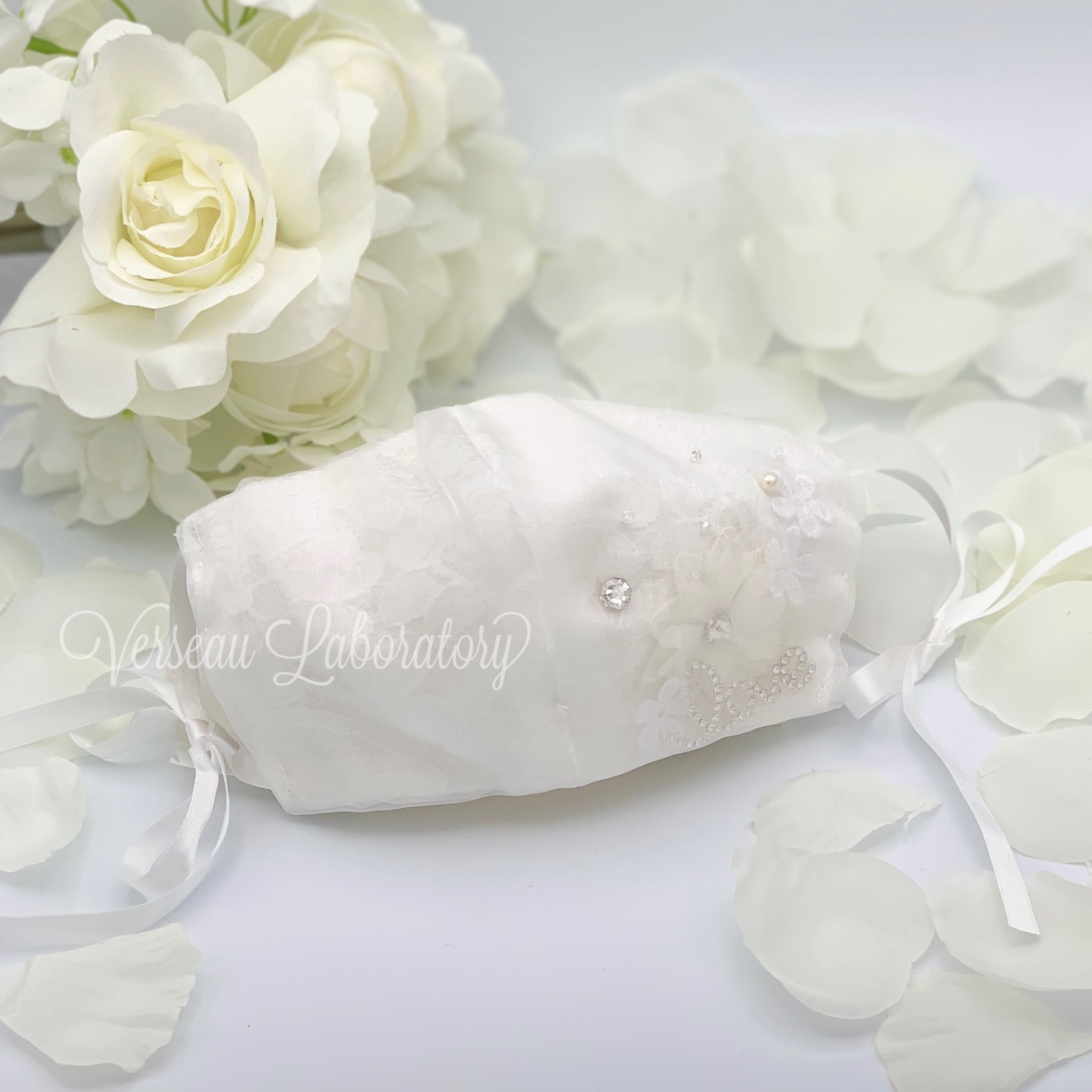 レースの上にオーガンジーを2重に重ね、重ねたオーガンジーの中にカモミールと小花とLOVEが隠れています。それは、まるで妖精のベールのよう。オーガンジーの中でふんわり妖精のように小さなお花たちが動き回っっています。