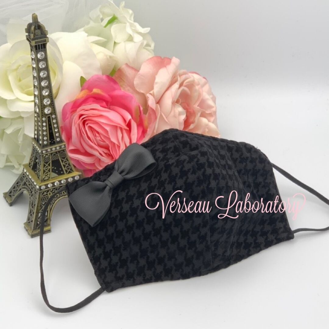 879 【セール】 ペア2枚ベロア千鳥格子 リボンあり普通サイズ+リボンなし大判サイズ マスク