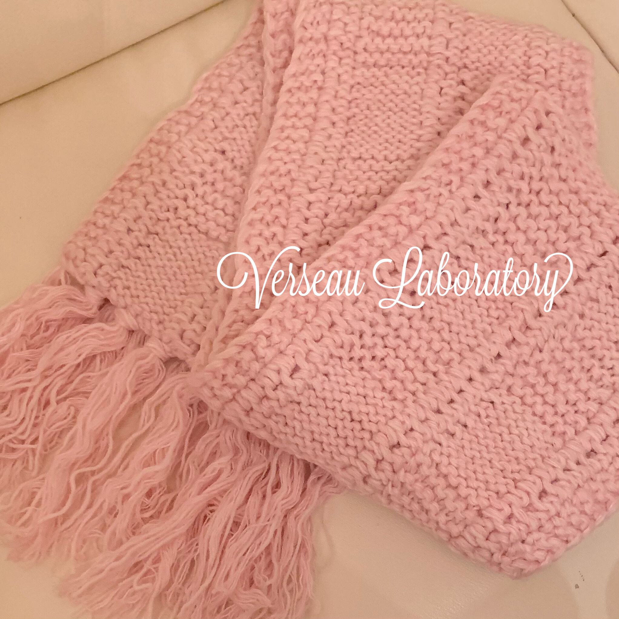 ガーリーなベルベットおりぼん付きニット帽と手編みマフラーをコーデのアクセントに。パーティーピンクでキュートに。
