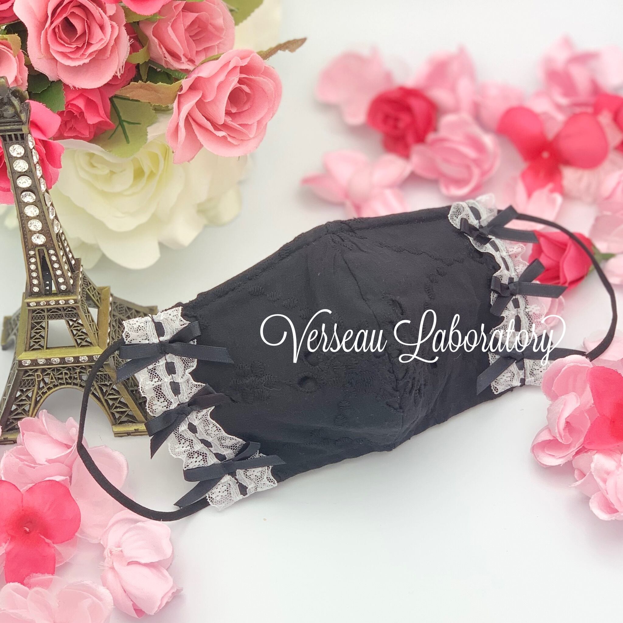 ワンピース、マスク、カチューシャの3点おそろいの商品です。色はネイビー、黒、白の3色展開。綿100%のコットンレースだからお肌にとってやさしい仕上げです。