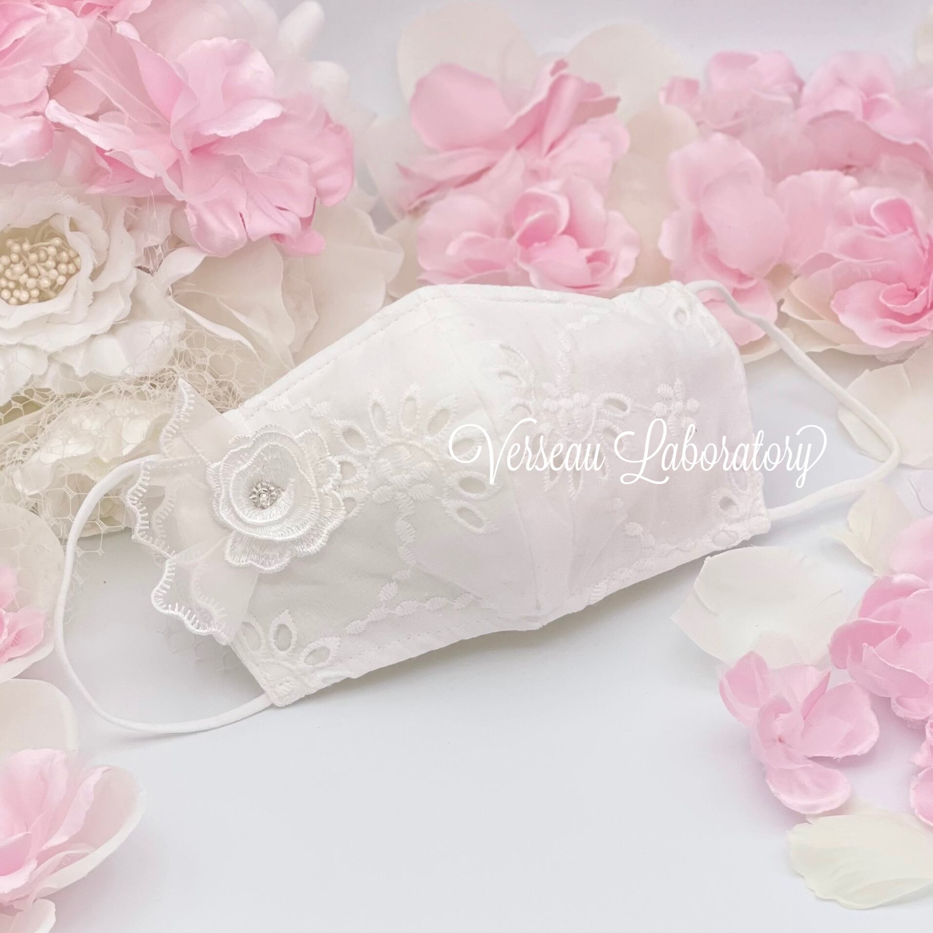 ワンピース、マスク、カチューシャの3点おそろいの商品です。色はネイビー、黒、白の3色展開。綿100%のコットンレースだからお肌にとってやさしい仕上げです。