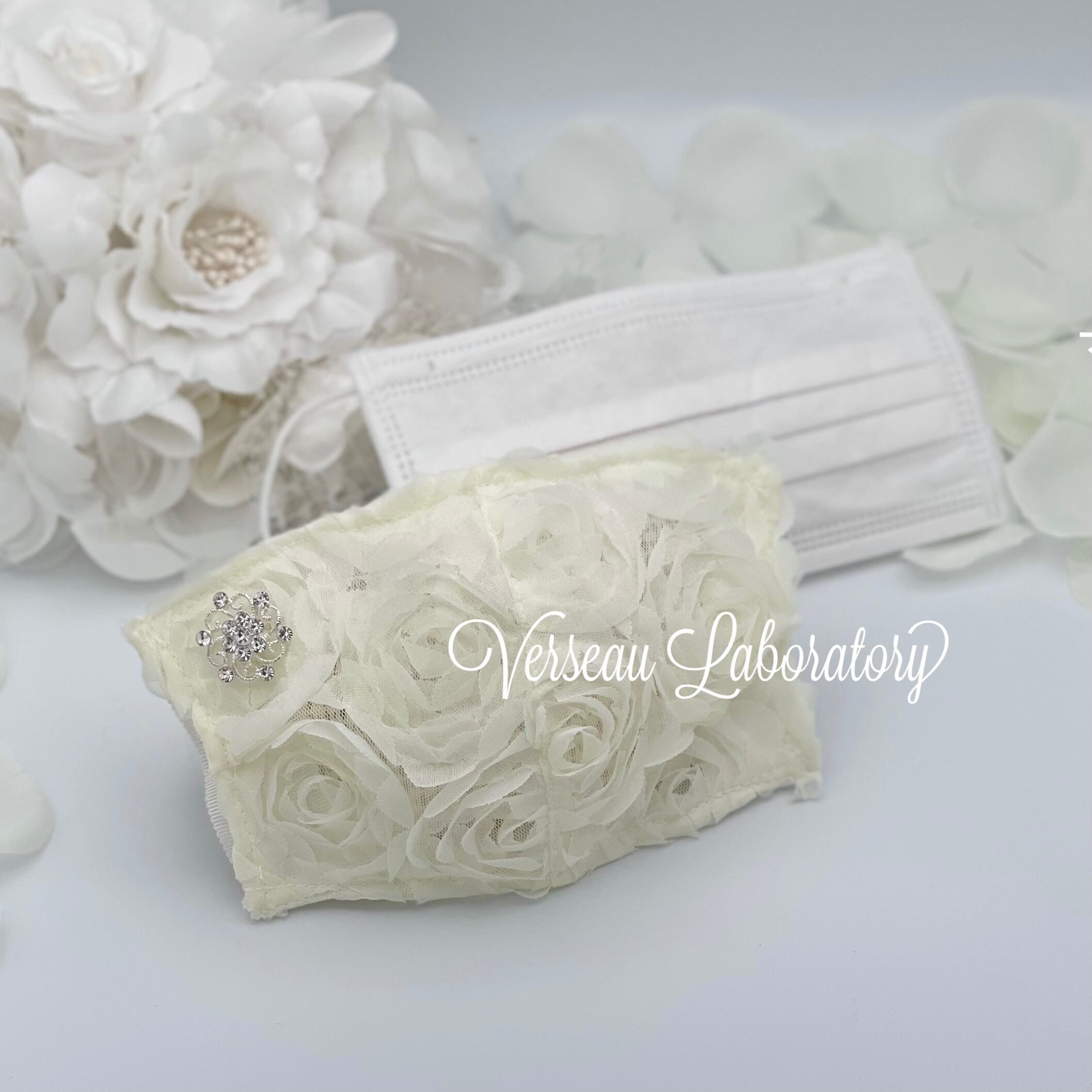 646 【セール】 マスクカバー&マスクチェーンセット 1重タイプ 不織布用マスクカバー 薔薇レースシリーズ ローズクリーム スワロブリリアントフラワー 洗える おしゃれ マスクカバー | Verseau Laboratory