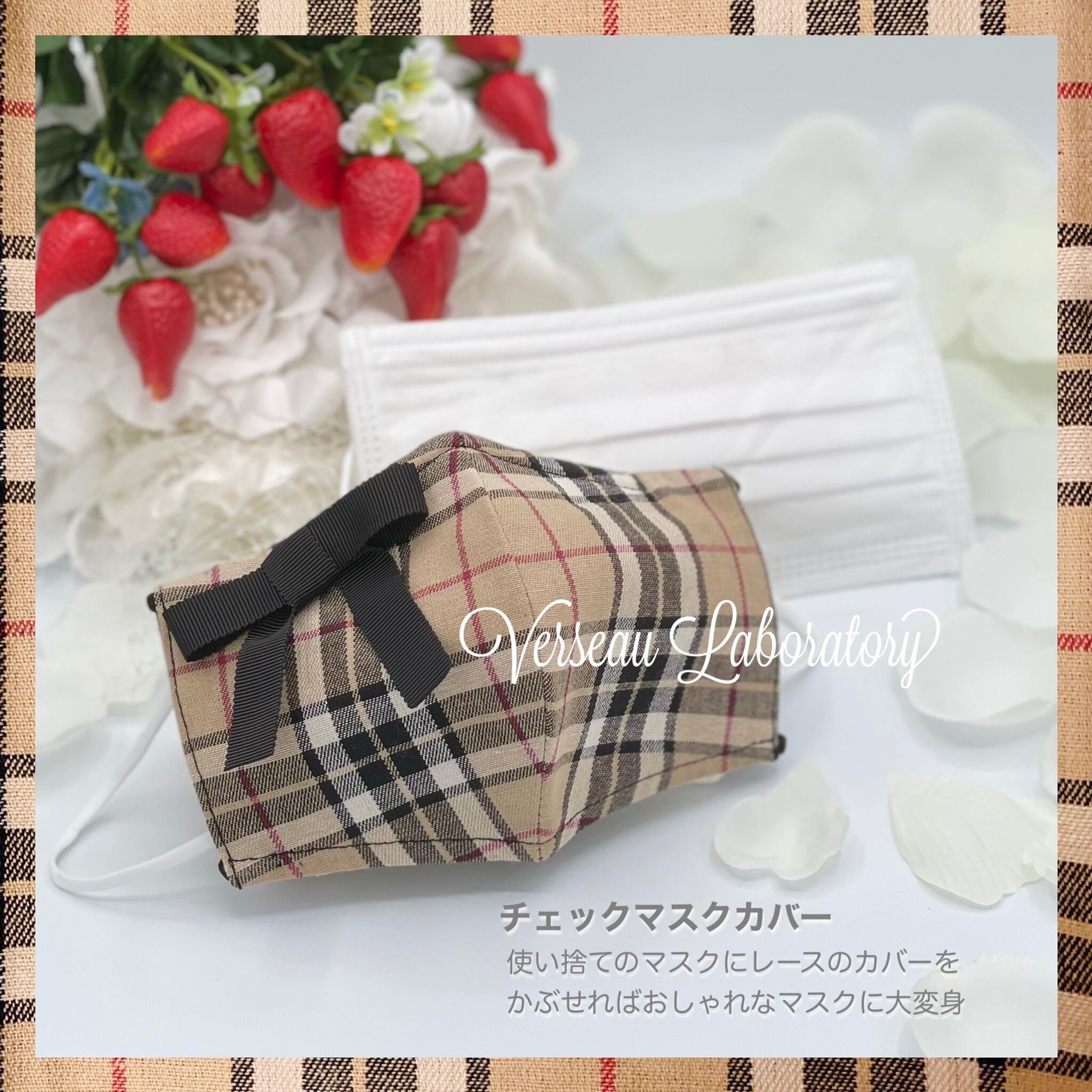 管理NO210907-926@1重マスクカバー ベージュ チェック 細リボン