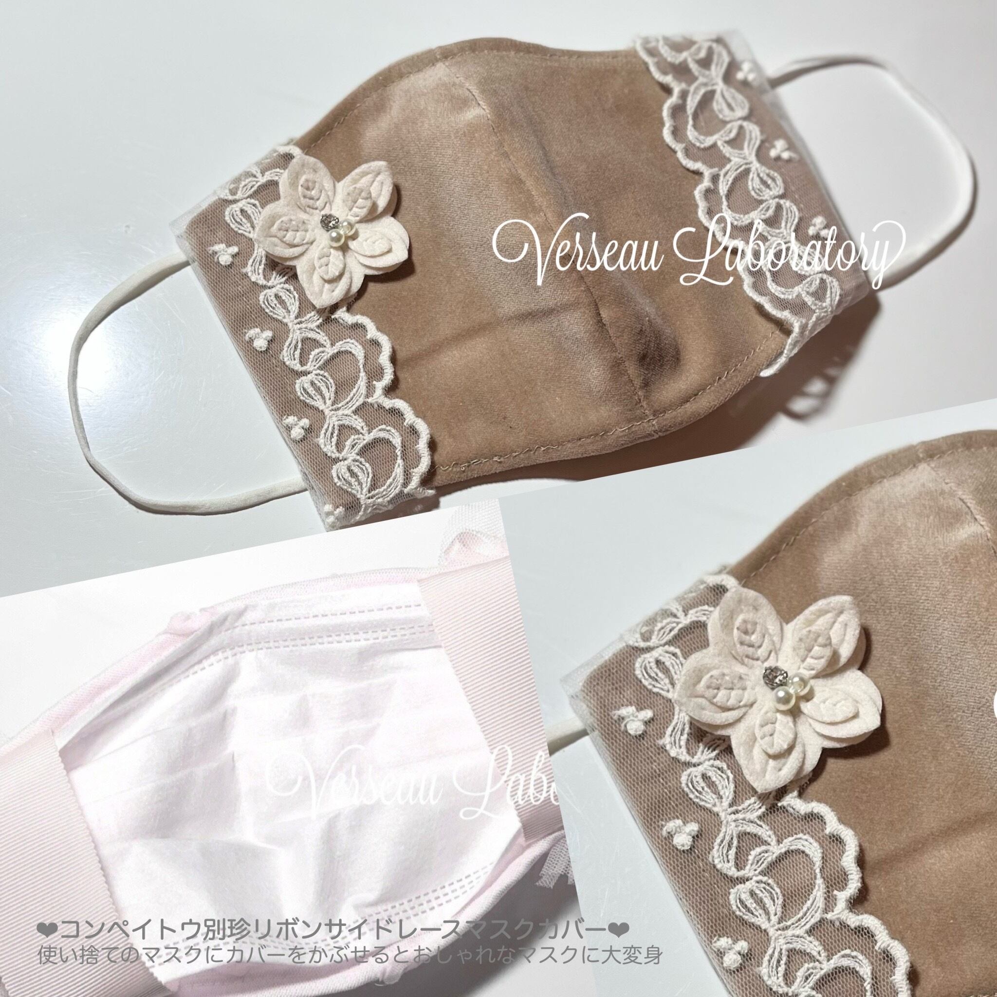 管理NO220103-A98@マスクカバー&ケース 別珍リボンサイドレースコンペイトウベージュ