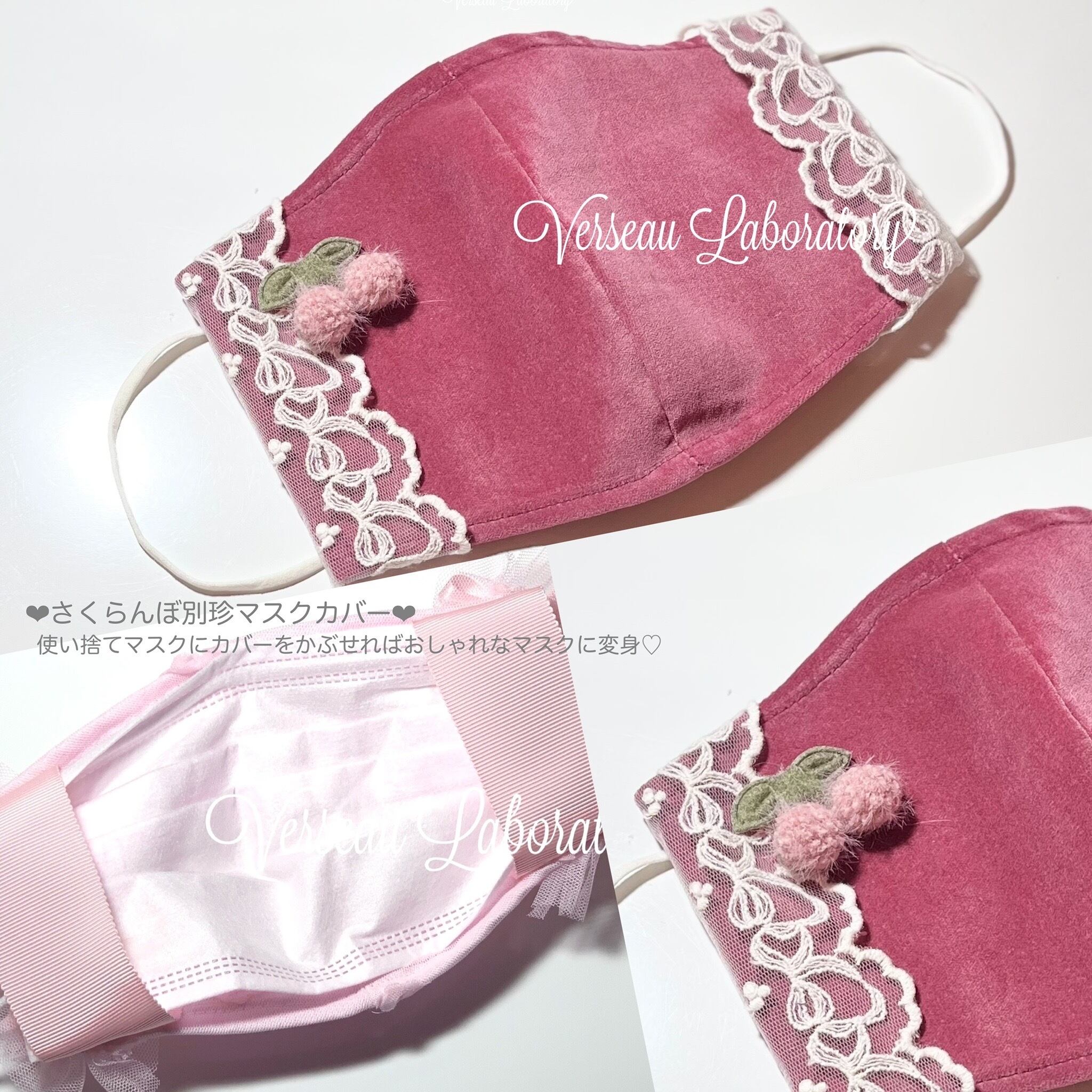 B22 【セール】 マスクカバー 3枚セット 別珍リボンサイドレース さくらんぼ 不織布マスク用マスクカバー UV対策 おしゃれ かわいい マスク に変身 ダークピンク/パープル/ベージュ | Verseau Laboratory