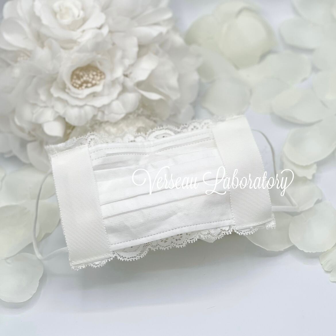 中央にパールのついた繊細なお花が右と左下に1つずつついたかわいい1重タイプのマスクカバーです。普段使いからお出掛けまで幅広く使っていただけます。
