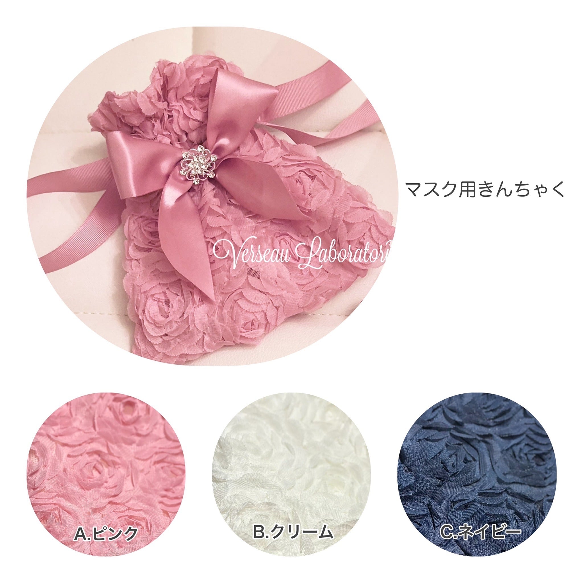 E25 【セール】 選べる3色 マスク用きんちゃく ピンク/クリーム/ネイビー 薔薇レースシリーズ きんちゃく ブリリアント リボン 洗える おしゃれ 巾着 プレゼント ギフト 敬老の日 | Verseau Laboratory