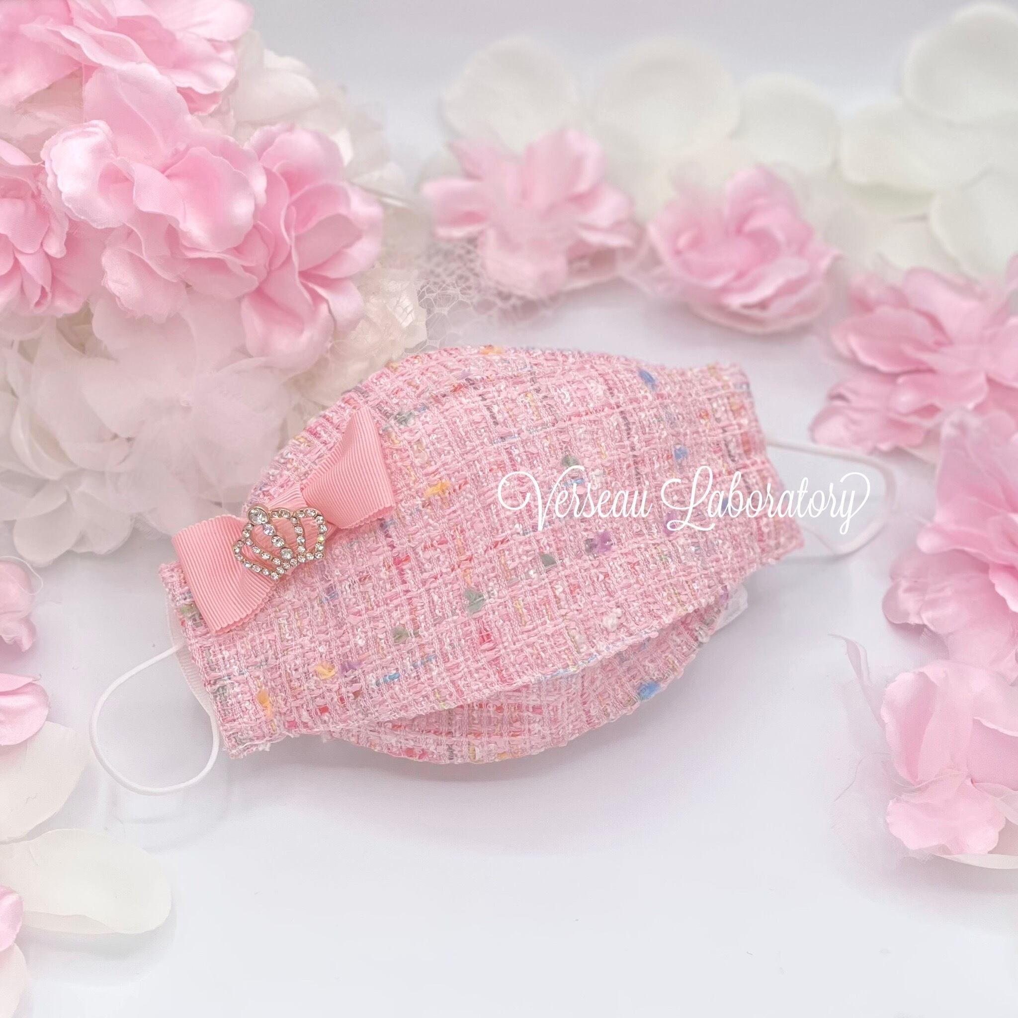 管理NO230311-H30@柳葉型マスクカバー ツイードシリーズ ピンク リボンクラウンゴールド