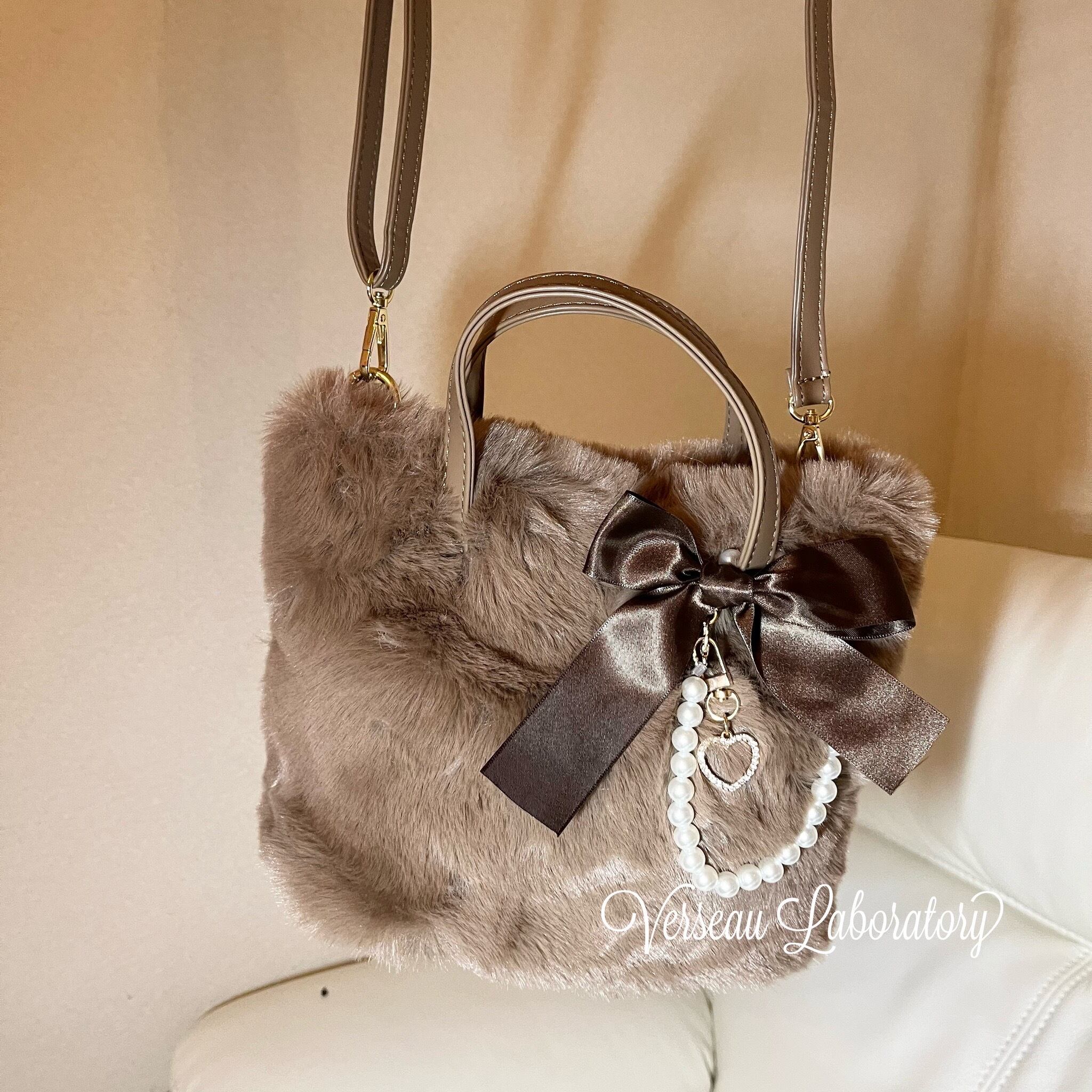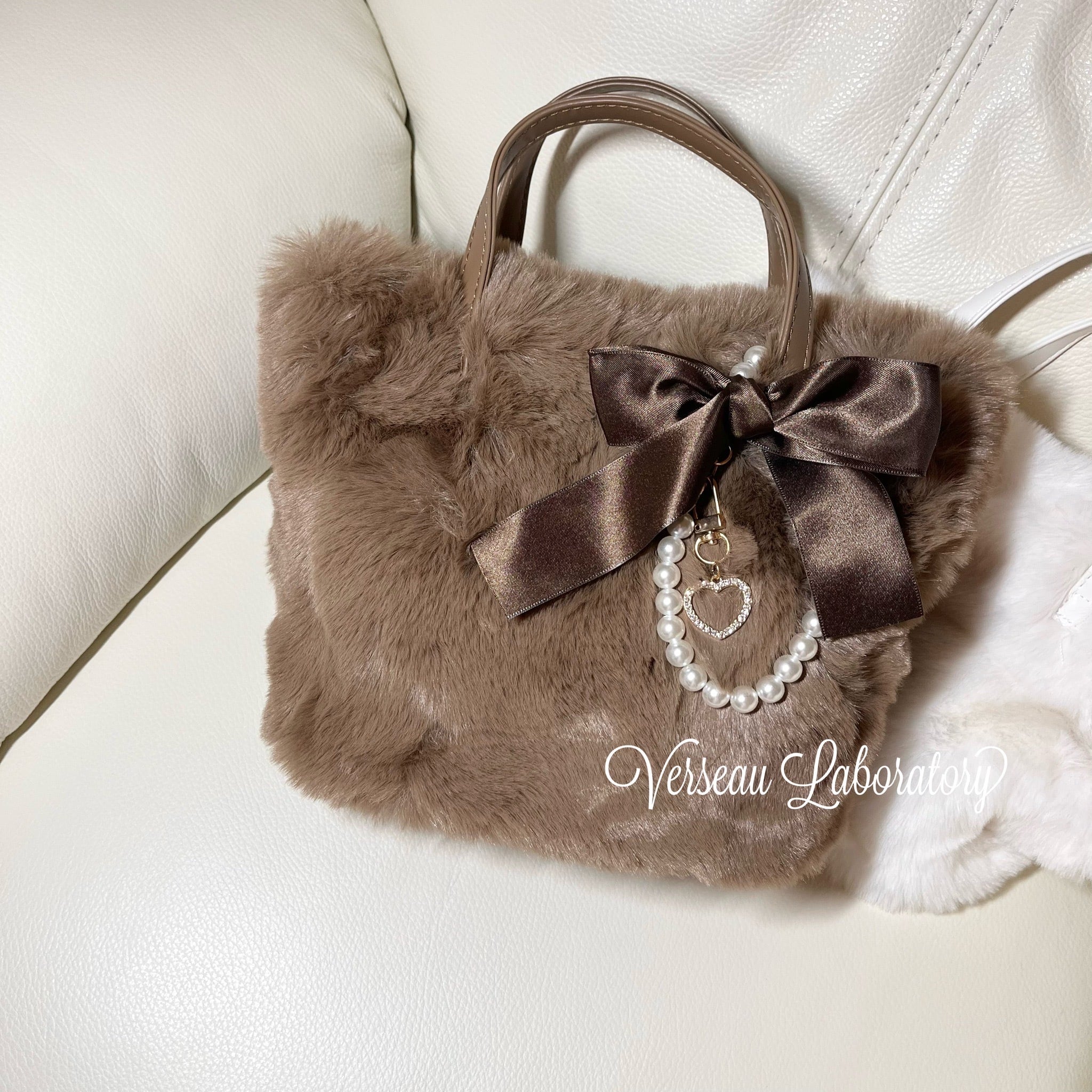 I43 【新発売】 新作トートバッグ new天使のミニトートバッグ おりぼん&パールハート ベージュ レディース 人気のフェイクファー 小さめ かわいい カバン ショルダー | Verseau Laboratory